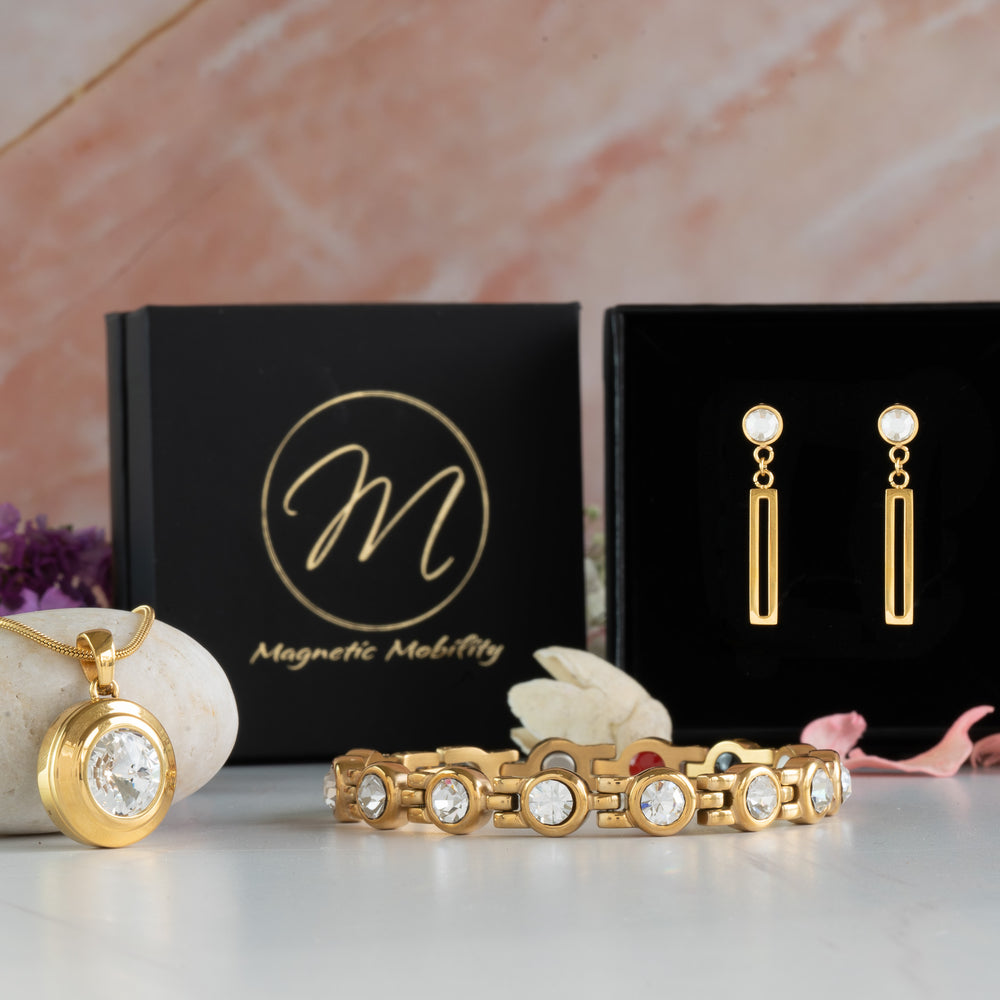 Introducing the Angelica’s Sun Gift Set, a harmonious blend of style and benefits. This exquisite set, tailored for women, brings together a 4in1 Magnetic Bracelet, Magnetic Earrings, and a Magnetic Necklace, all bathed in a lustrous gold finish. Each piece is meticulously adorned with a White Swarovski crystal, with the bracelet featuring crystals on every link, radiating a timeless charm.