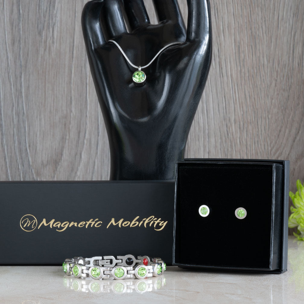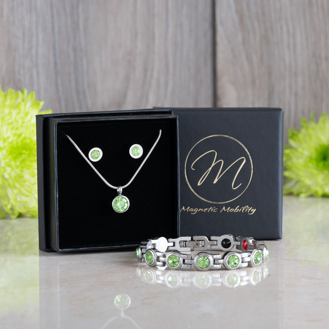 🌟 August Birthstone Bundle: Magnetic Bracelet, Necklace, and Earrings with Swarovski Peridot - Save 10%