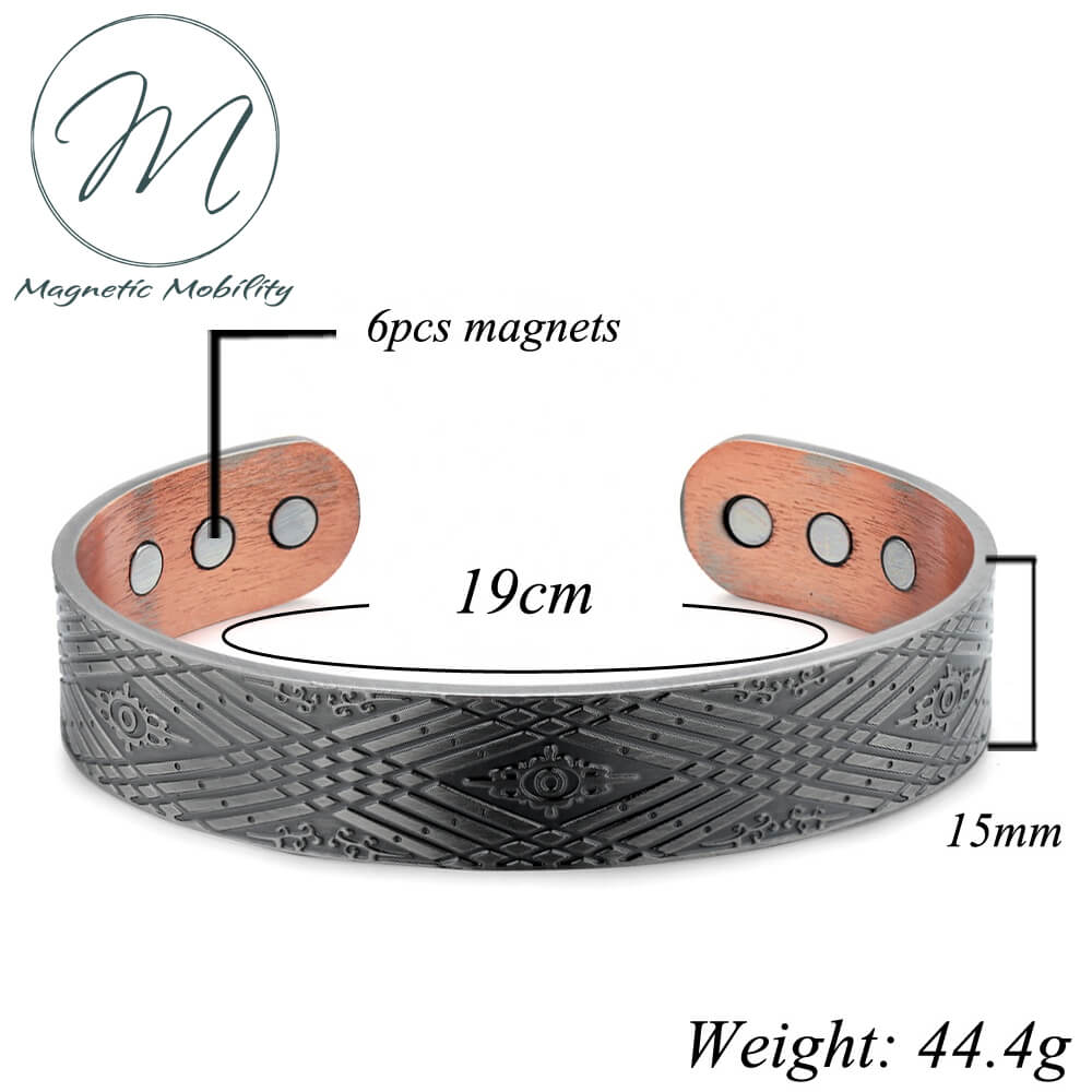 Special Note for Copper Cuff Bracelets: Our copper cuff bracelets are available in sizes ranging from 14cm to 19cm. Larger sizes are typically suitable for most men, while smaller sizes may be better for those with slender wrists. While these bracelets are moldable, please be cautious when adjusting them to prevent damage. Copper's soft nature means that frequent bending or repeatedly putting on and taking off the bracelet may weaken it over time. Avoid bending the ends where the magnets are housed to prevent damage to the magnet-bonding. For a long-lasting accessory, it's best to set the bracelet to your size and then wear it continuously.